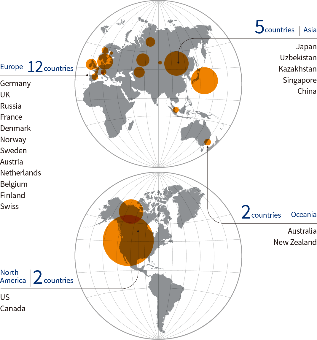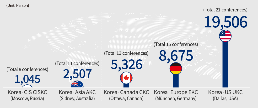 Event for the sharing of research performances by domestic scientists and engineers and overseas Korean scientists and engineers for each continent. (Total number of conferences per each country / number of participants)