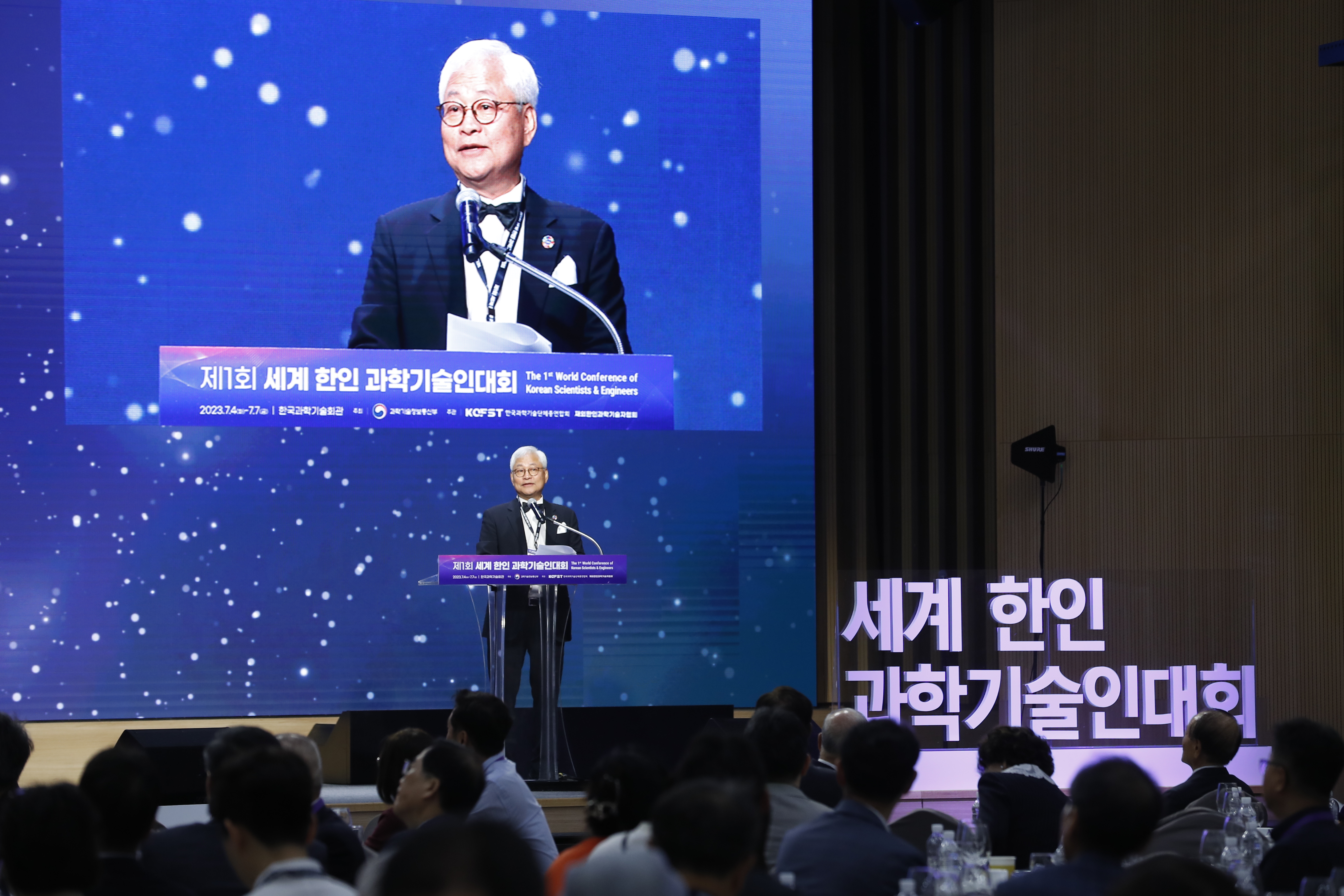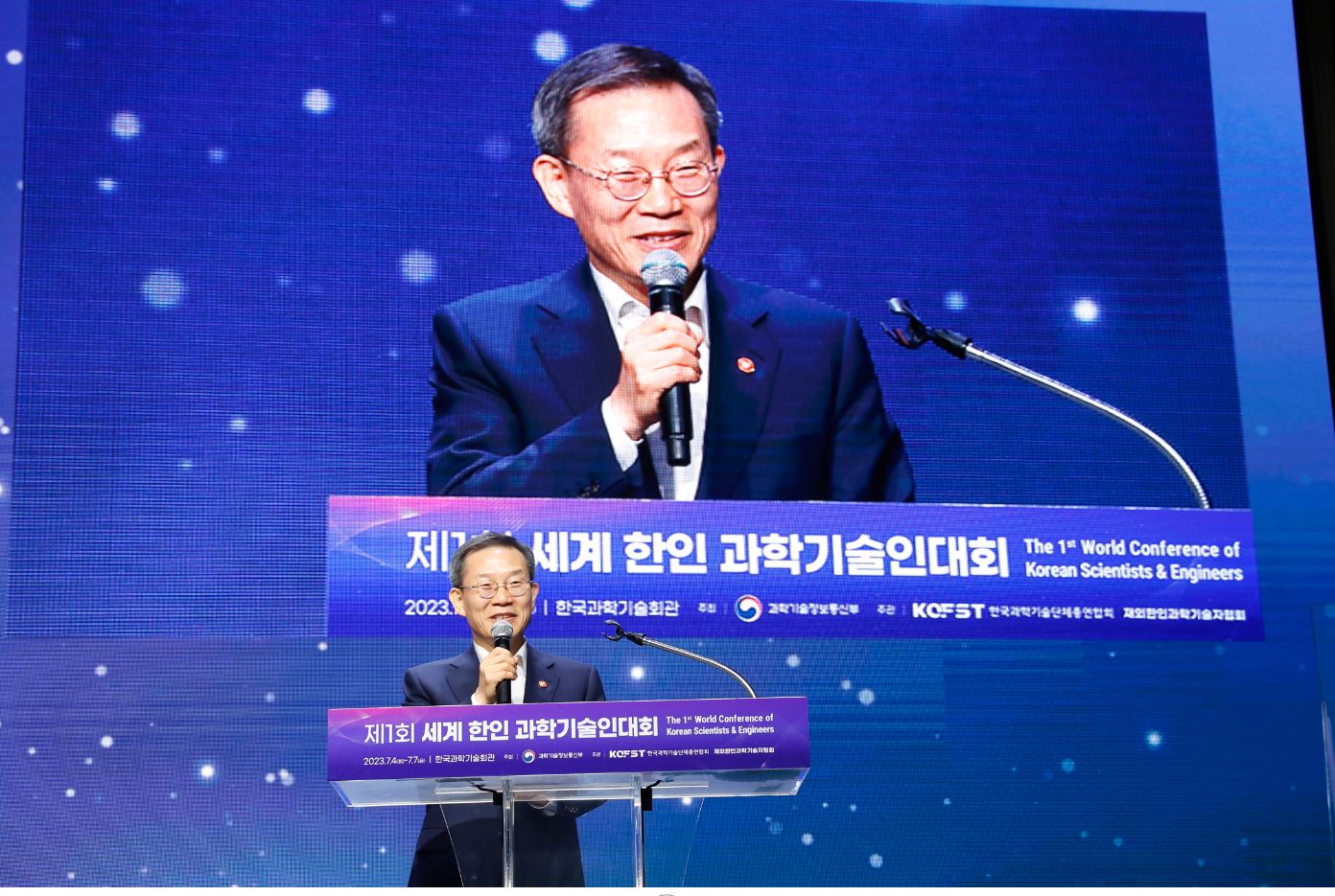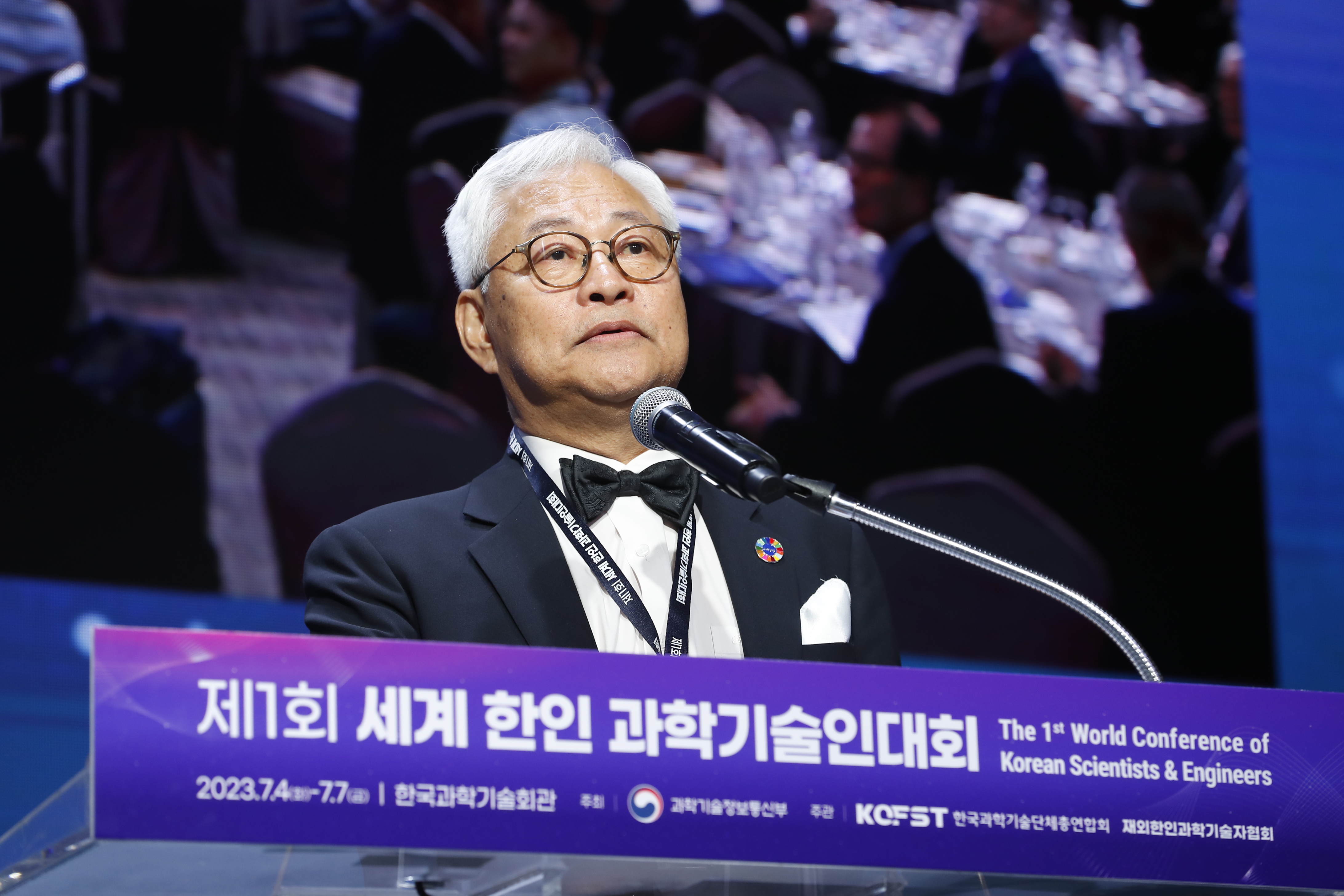 만찬_1. 이종호 과학기술정보통신부 장관이 7월 4일 서울 강남구 한국과학기술회관에서 열린 '제1회 세계 한인 과학기술인대회' 인사말을 하고 있다.