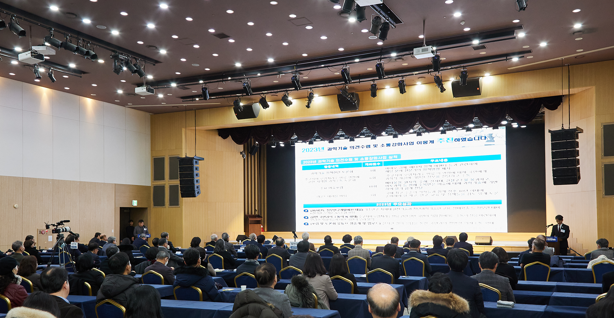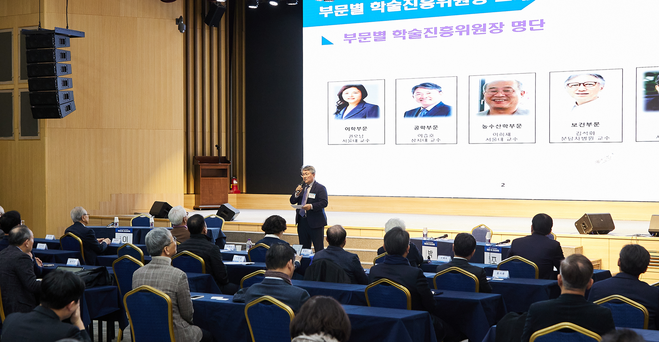 ▶1월 23일(화) 2024년 과총 회원단체 신년인사회에서 이승호 학술진흥위원회 위원장이 위원회 역할과 주요 사항을 설명하고 있다.