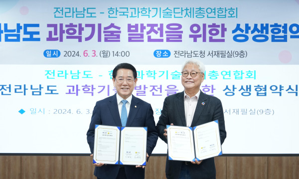 ▶2024년 6월 3일(월) 14시, 전라남도(도지사 김영록, 왼쪽)와 과총(회장 이태식, 오른쪽)이 교류·협력 업무 협약을 체결했다.