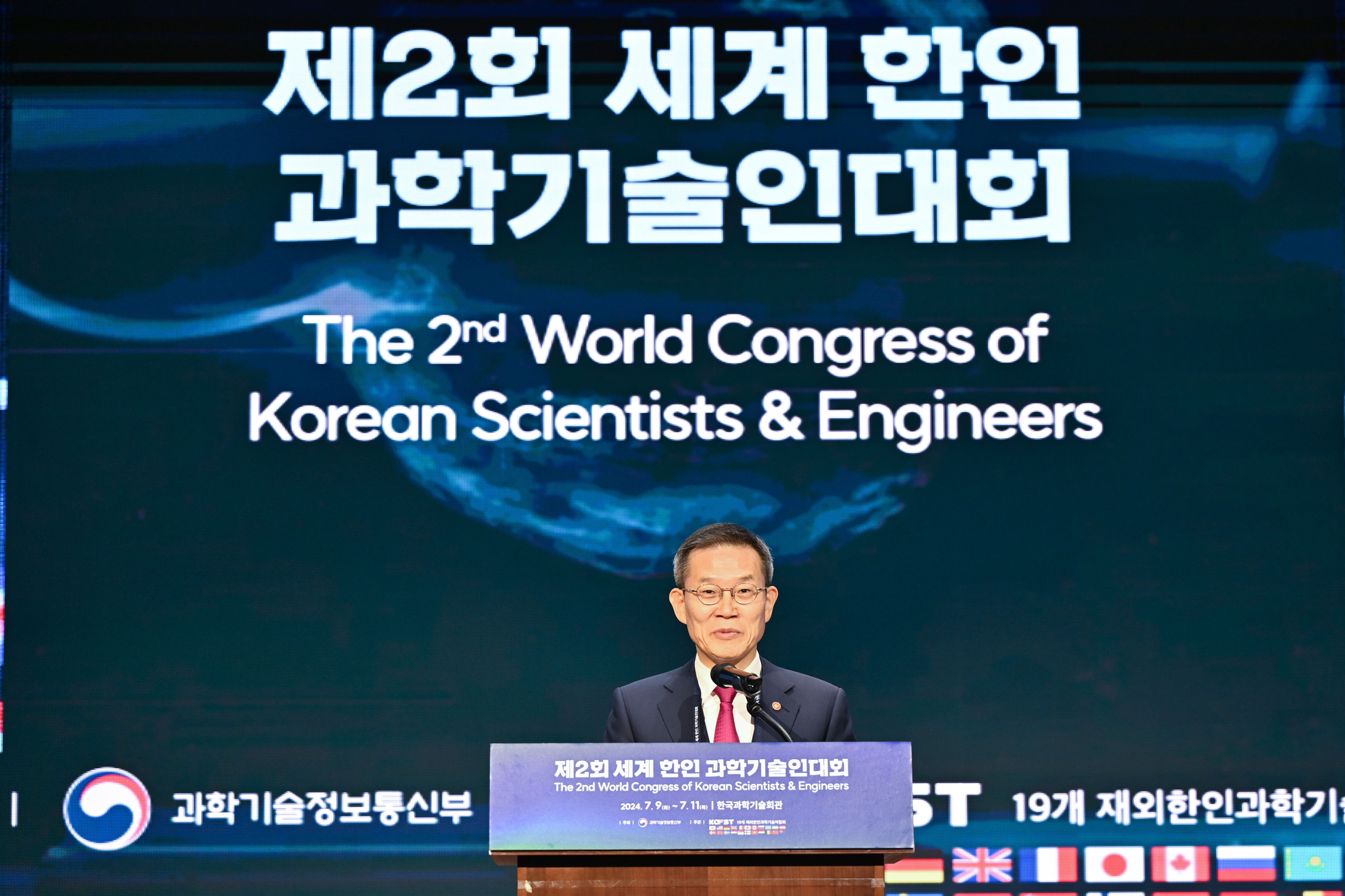개회식_3. 이종호 과기정통부 장관이 7월 10일 한국과학기술회관에 열리는 '제2회 세계 한인 과학기술인대회'의 개회식에서 축사하고 있다.