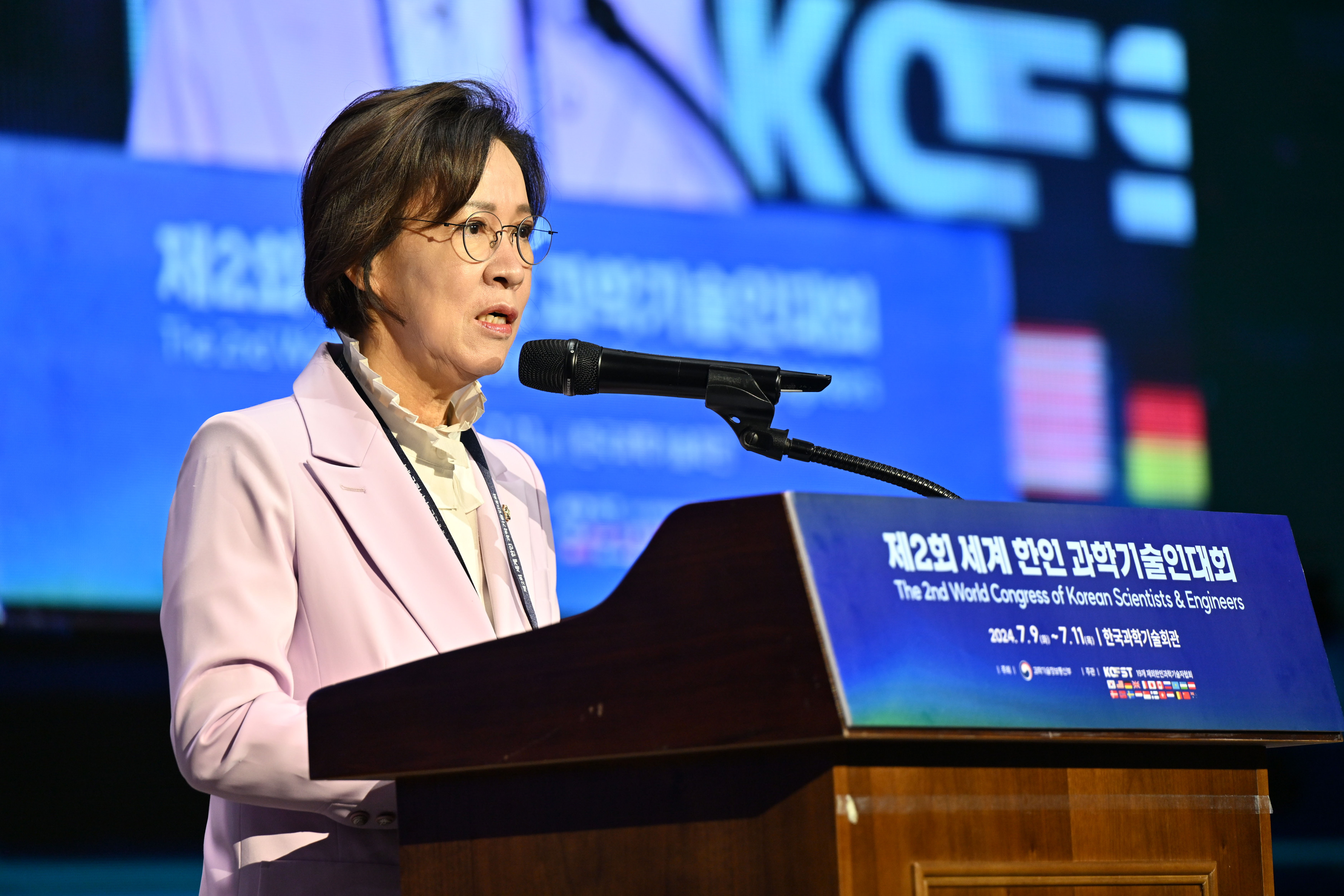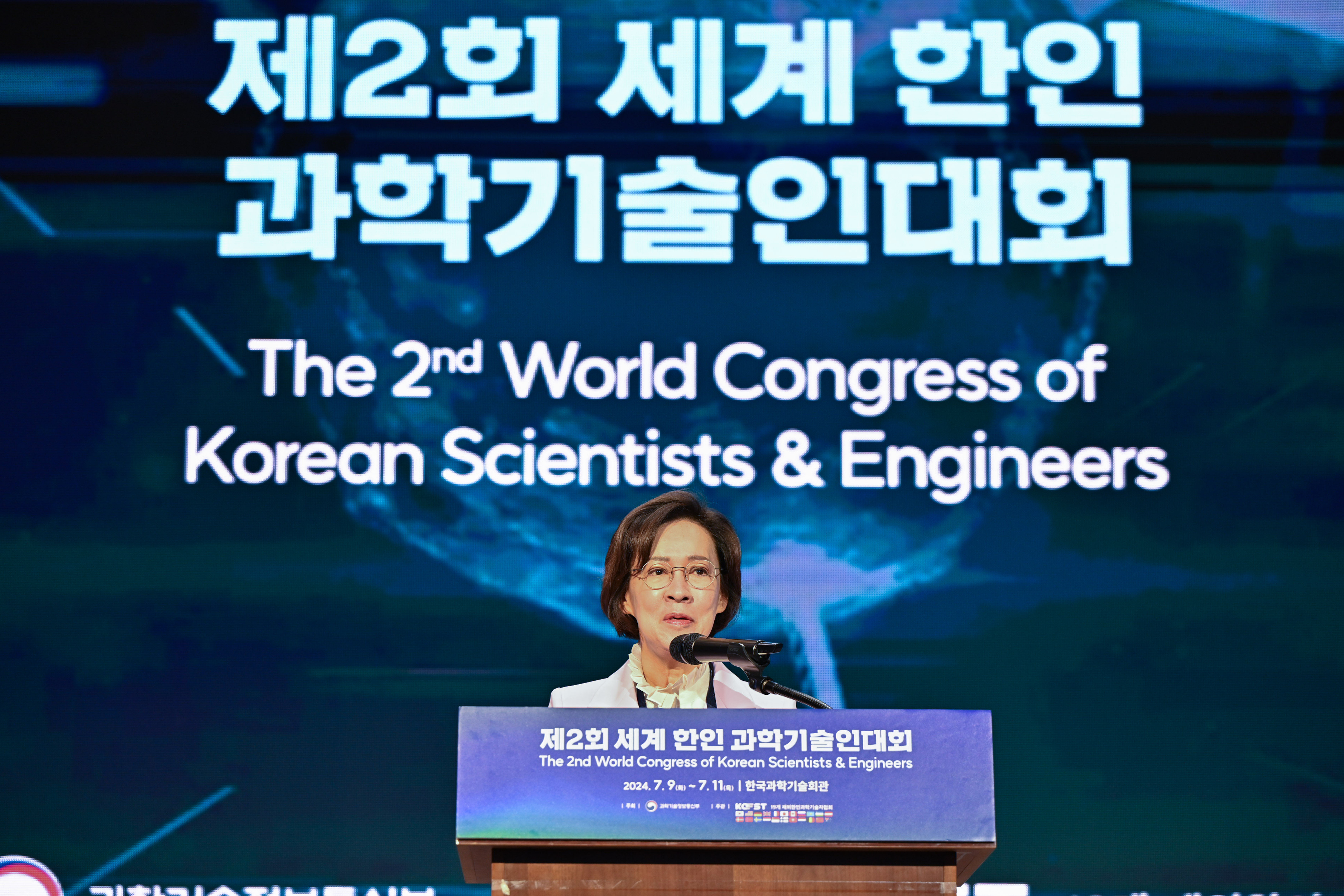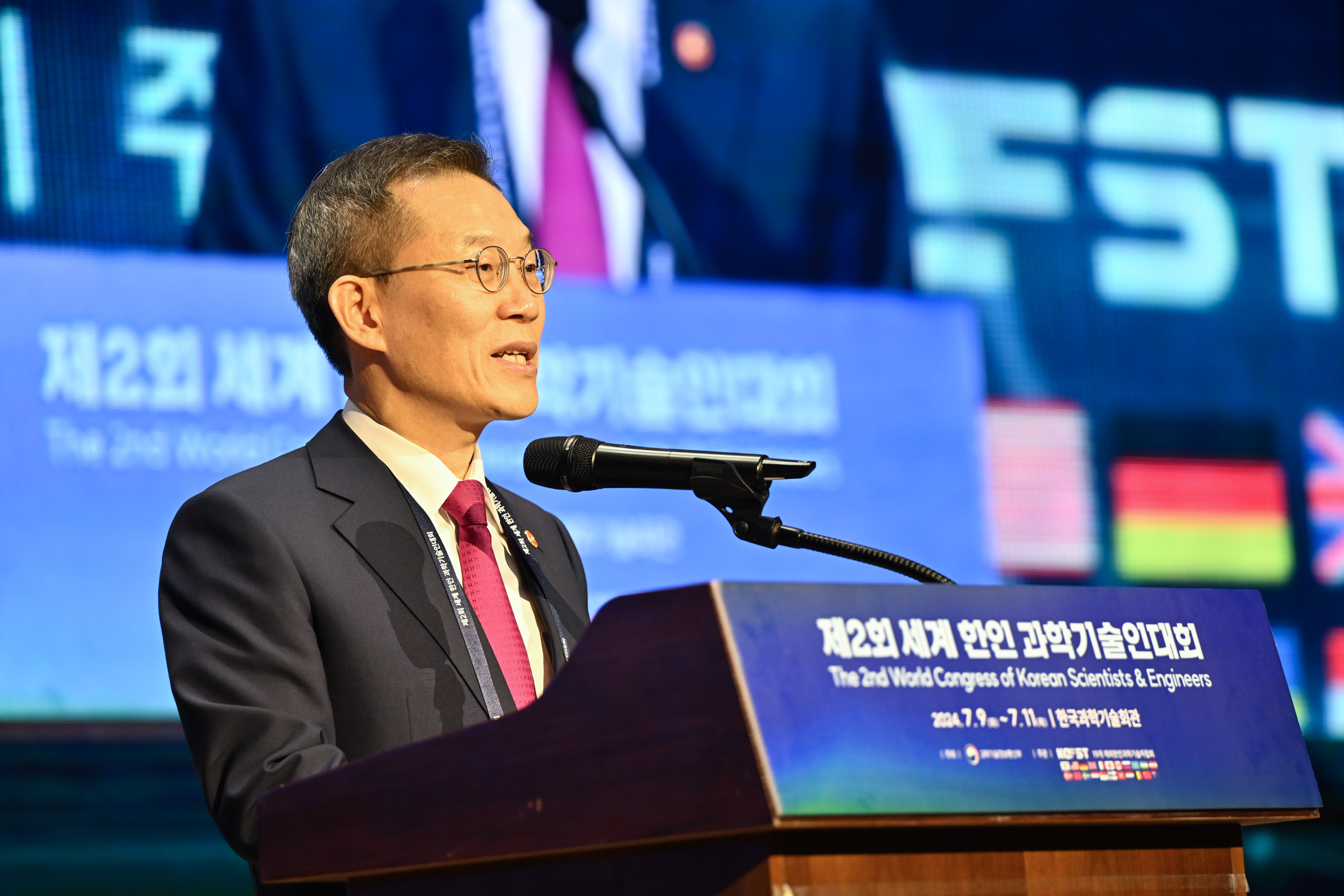 개회식4_. 이종호 과기정통부 장관이 7월 10일 한국과학기술회관에 열리는 '제2회 세계 한인 과학기술인대회'의 개회식에서 축사하고 있다.