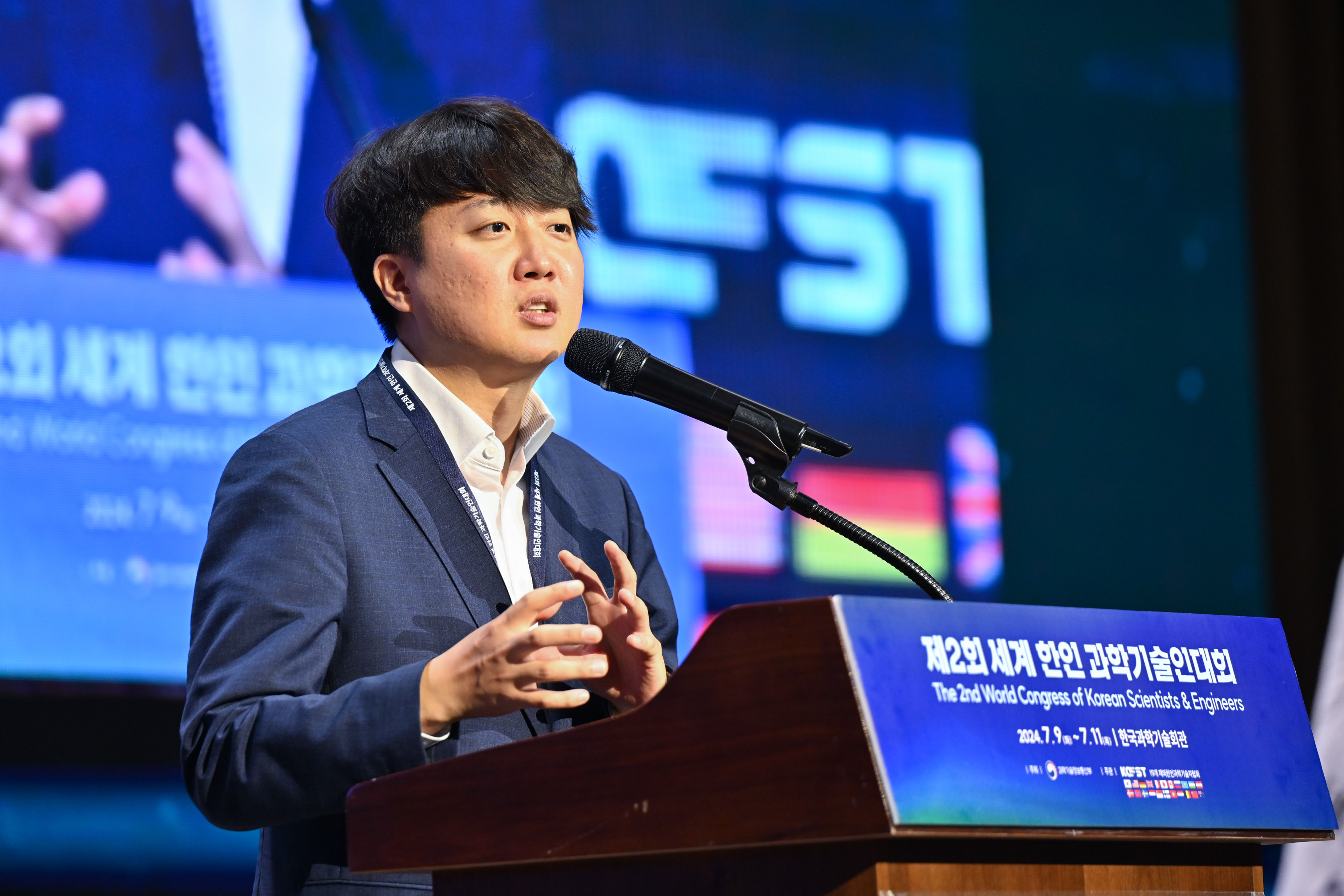 개회식8_. 이준석 의원이 7월 10일 한국과학기술회관에 열리는 '제2회 세계 한인 과학기술인대회'의 개회식에서 격려사를 하고 있다.