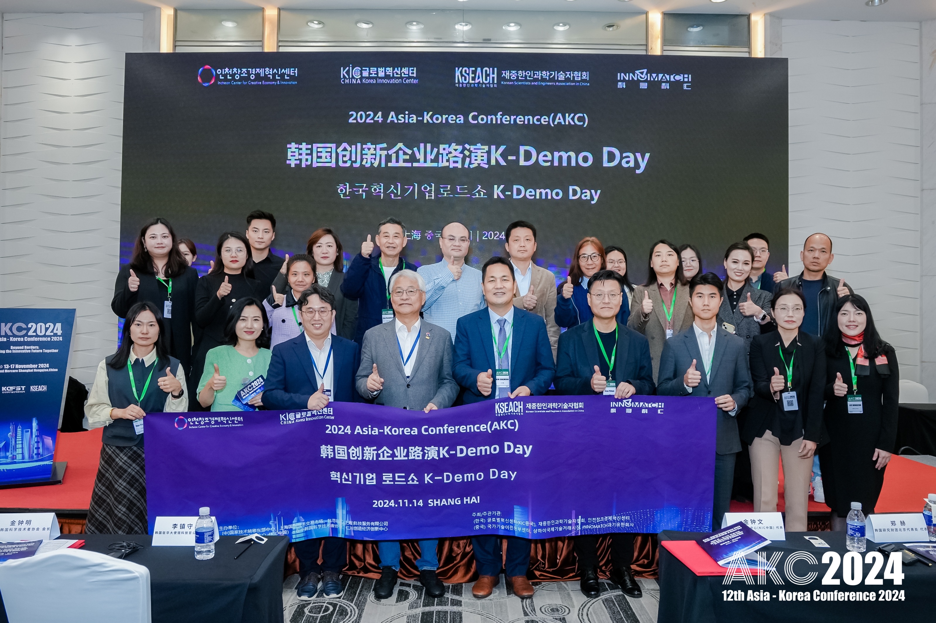 ▶ 2024 한-아시아 학술대회(AKC) SME Roadshow 사진(앞줄 왼족 두 번째부터 이유리 글로벌혁신센터(KIC중국) 경영지원부장, 이태식 과총 회장, 김종명 재중과협 회장, 김종문 글로벌혁신센터(KIC중국) 센터장, 김필한 ㈜아이빔테크놀로지 대표이사, 윤성준 ㈜포투가바이오 대표이사, 이지원 ㈜바스젠바이오 이사, 이동은 ㈜브이에스팜텍 이사)