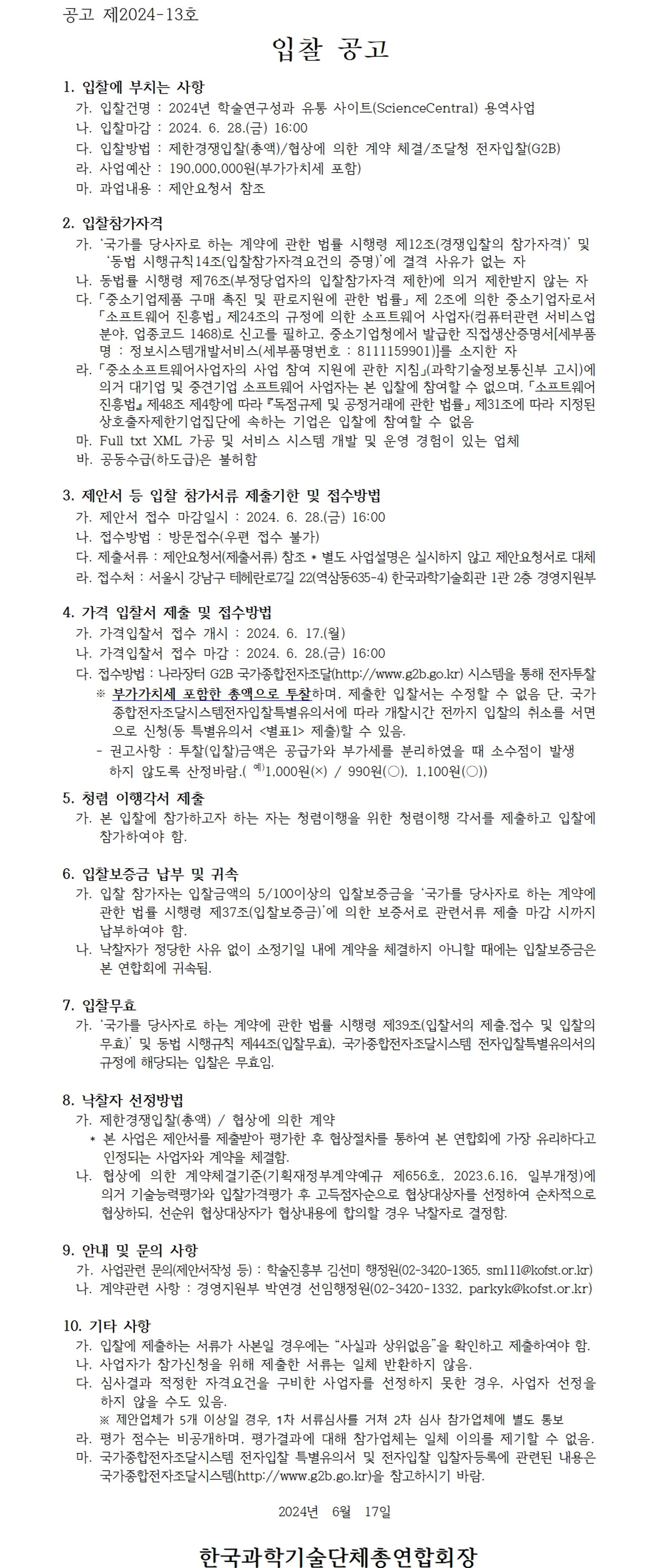 2024년도 학술연구성과 유통 사이트(ScienceCentral) 용역사업 입찰
