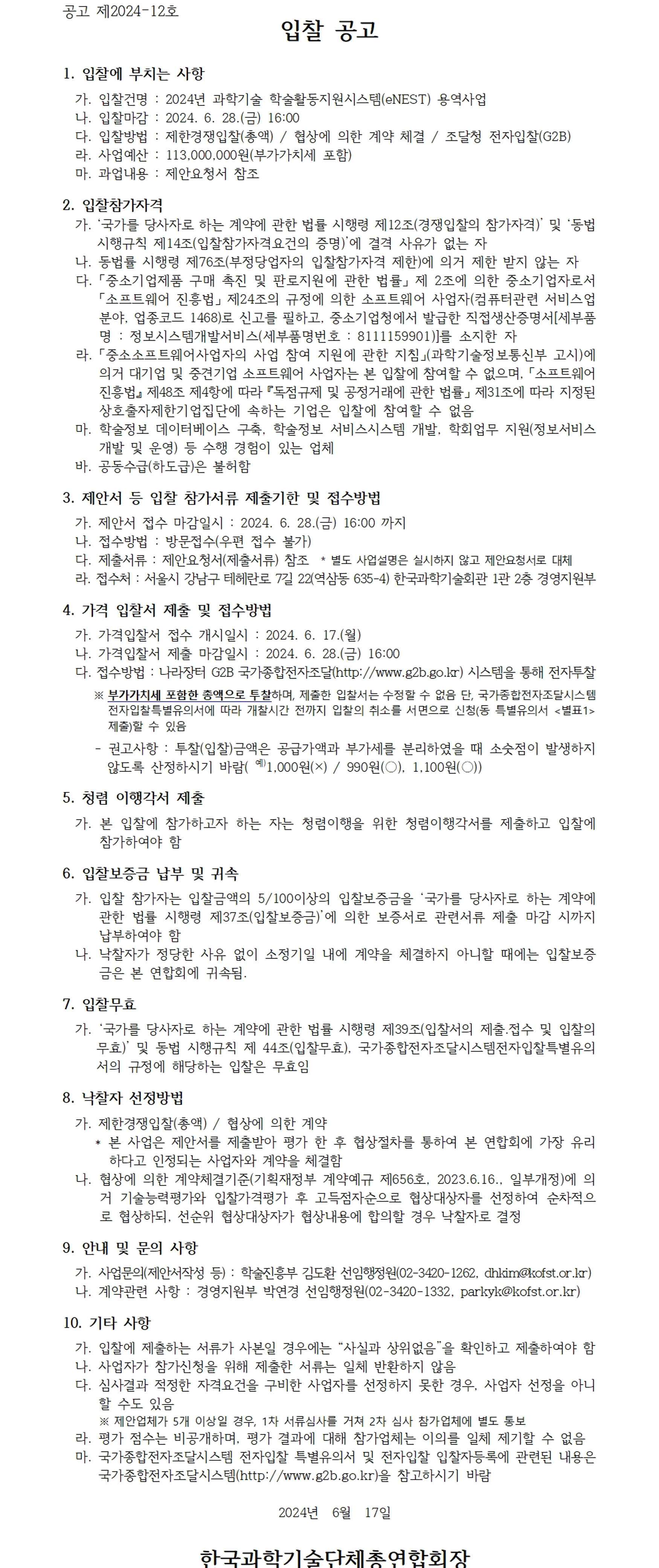 2024년 과학기술 학술활동지원시스템(eNEST) 용역사업 입찰
