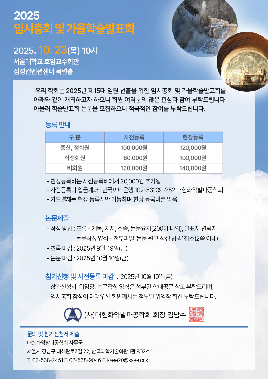 - 사전등록비 입금계좌 : 한국씨티은행 102-53109-252 대한화약발파공학회