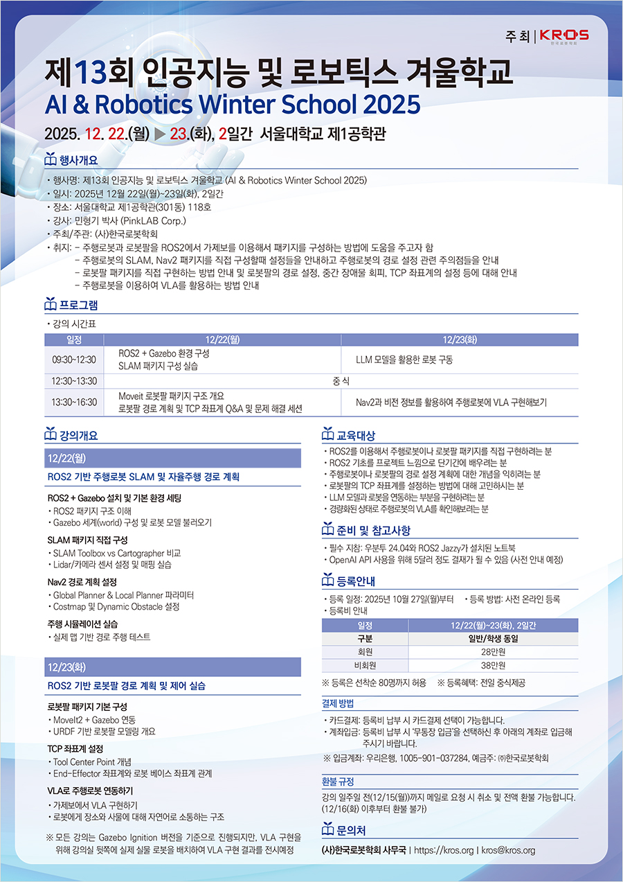 [한국로봇학회] 제13회 인공지능 및 로보틱스 겨울학교 (AI & Robotics Winter School 2025)