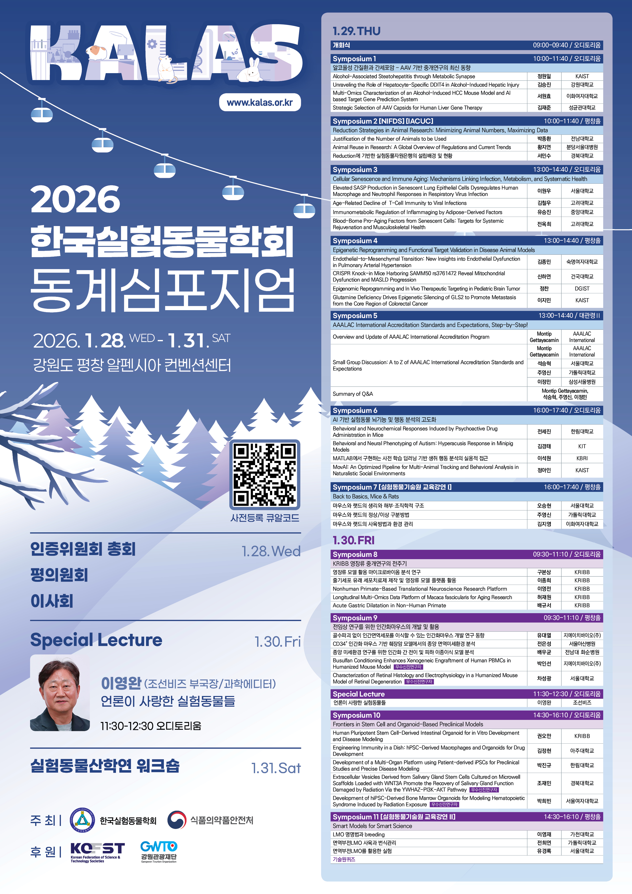 한국실험동물학회는 다가오는 2026128() - 131()에 강원도 평창 알펜시아 컨벤션센터에서 2026 한국실험동물학회 동계 심포지엄(2026 KALAS Winter Symposium)을 개최합니다.