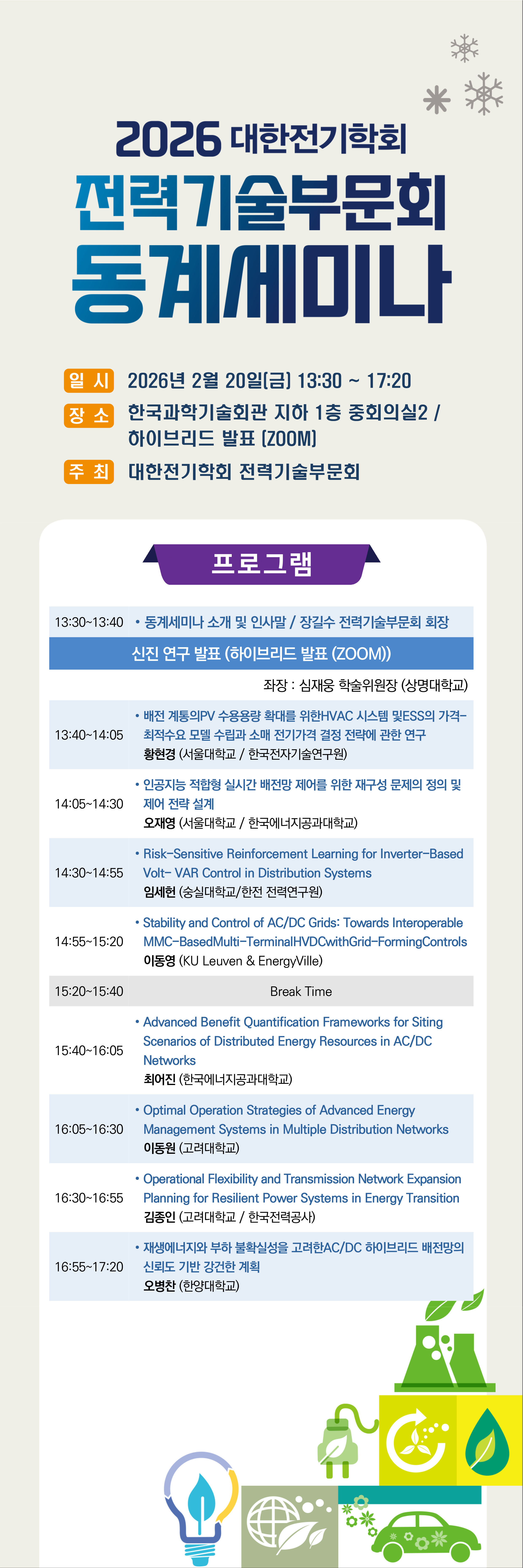 2026년도 대한전기학회 전력기술부문회의 동계세미나를 아래와 같이 개최하고자 합니다. 금번 동계세미나는 최근에 박사학위를 취득하신 신진연구자분들의 연구내용 소개와 부문회 전문가 초청강연을 함께 진행하여 유익한 토론의 장을 마련하고자 합니다.