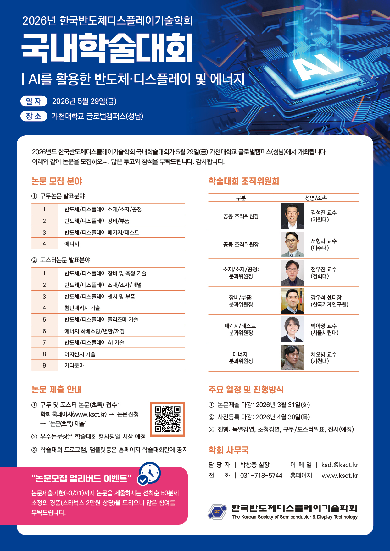 학회에서는 반도체/디스플레이 학술발전을 위해 2026년 국내학술대회를 오는 5월 29일(금) 가천대학교 (경기도 성남시 수정구 성남대로 1342